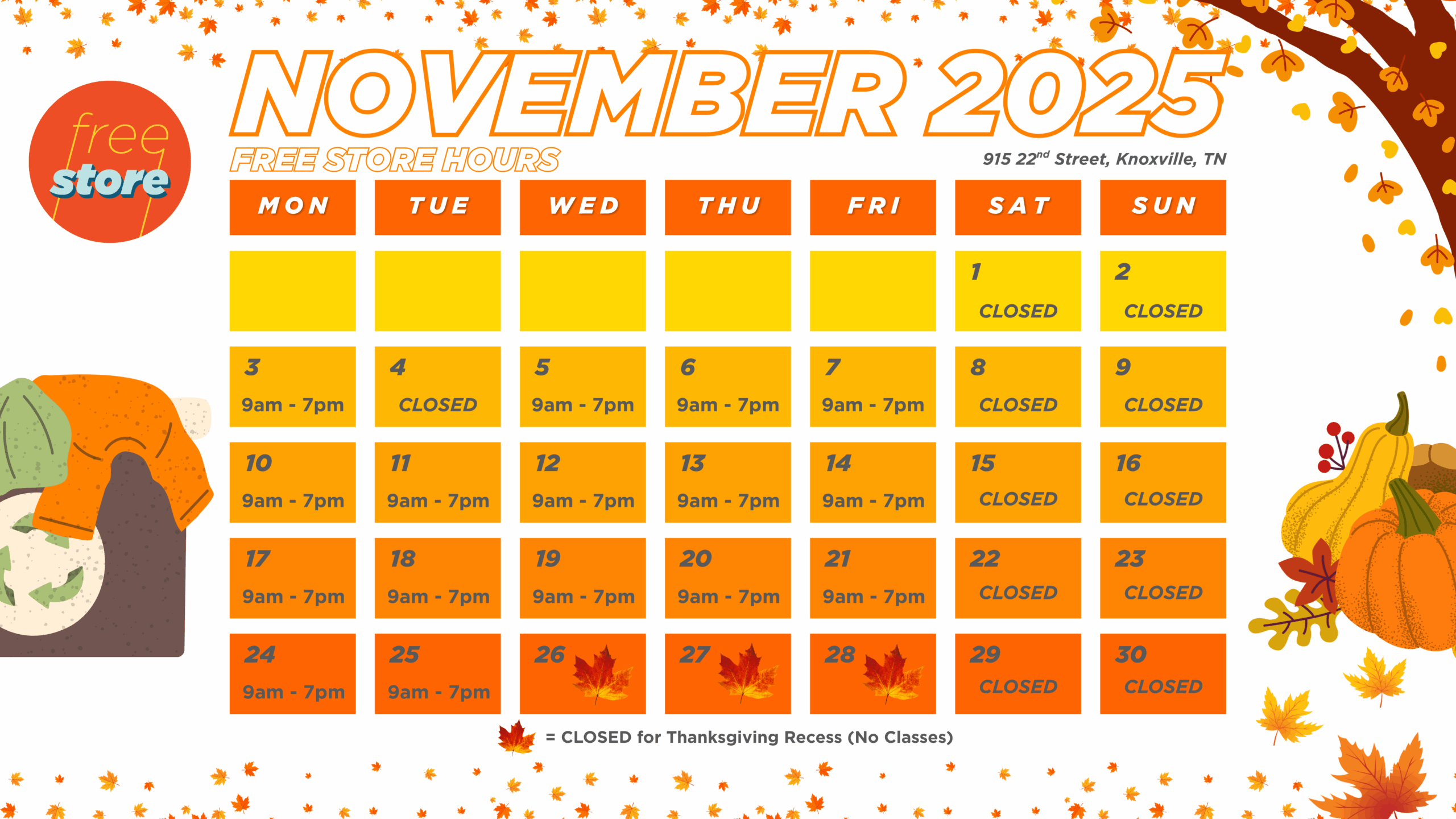 In addition to our open hours, we will hold pop-ups throughout the school year at different locations on campus. Follow our our Instagram @freestore_utk to find details about these and other events, and also to keep up with any schedule changes we may encounter throughout the semester. Hours will change each semester as our student workers keep the doors open around their school schedules.